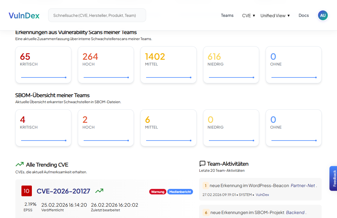 Unterschiedliche Teams betreiben Services, entwickeln Software oder verantworten Infrastruktur. VulnDex bildet ihre individuelle Struktur ab und verknüpft Schwachstellen direkt mit den zuständigen Einheiten. Informationen aus CVE-Watchlists, Vulnerability-Scans, SBOM-Monitoring und Beacon-Daten fließen in eine zentrale Sicht. Diese Sicht besteht aus Abteilungen, Teams, Produkten oder Services. Priorisierung erfolgt im organisatorischen Kontext und wird durch Vulnerability Intelligence unterstützt.